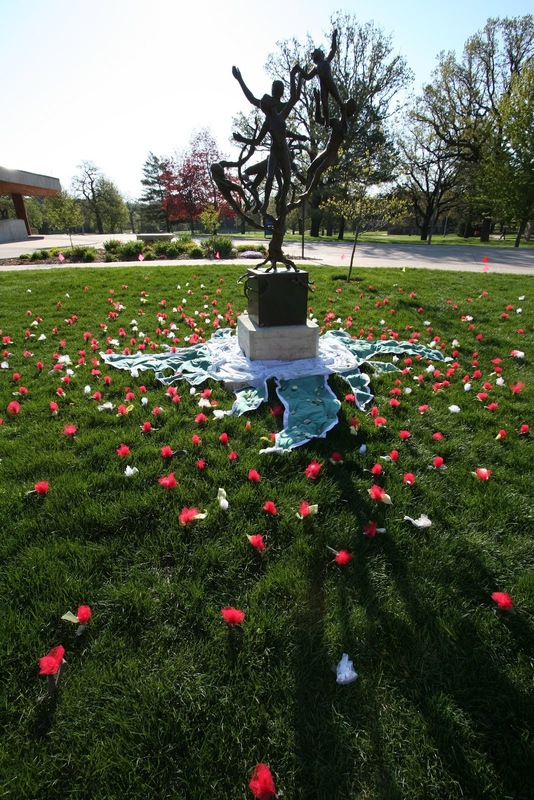 Flowers are arranged around the Tree of Life statue, using a fabric wheel