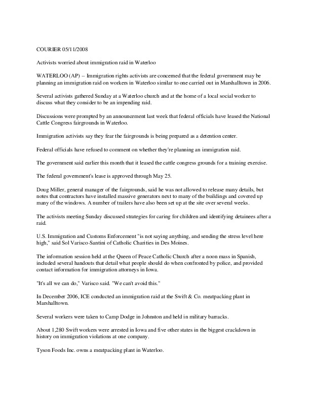 Newspaper article from May 11, 2008, Courier: Immigration rights activists are concerned that the federal government may be planning an immigration raid on workers in Waterloo similar to one carried out in Marshalltown in 2006.