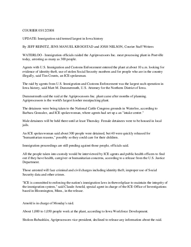 Newspaper article from May 12, 2008, Courier: Immigration officials raided the Agriprocessors Inc. meat processing plant in Postville today, arresting as many as 300 people.