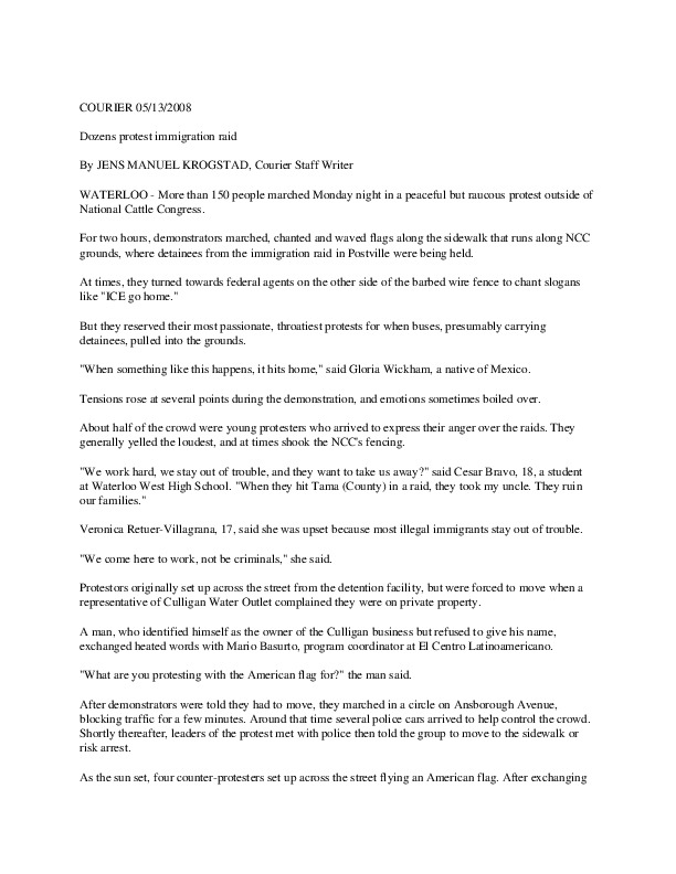 Newspaper article from May 13, 2008, Courier: More than 150 people marched Monday night in a peaceful but raucous protest outside of National Cattle Congress. For two hours, demonstrators marched, chanted and waved flags along the sidewalk that runs along NCC grounds, where detainees from the immigration raid in Postville were being held.