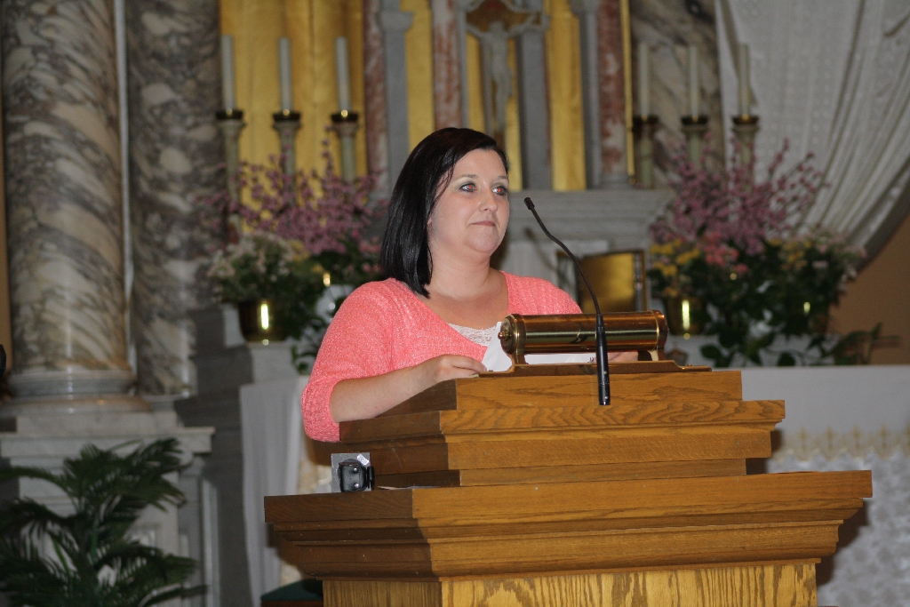 Dawn Hernandez speaks at the Interfaith Prayer Service, Immaculate Conception Catholic Church