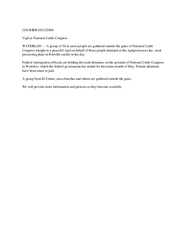 Newspaper article from May 12, 2008, Courier: A group of 50 or more people are gathered outside the gates of National Cattle Congress tonight in a peaceful vigil on behalf of those people detained at the Agriprocessors Inc. meat processing plant in Postville earlier in the day.