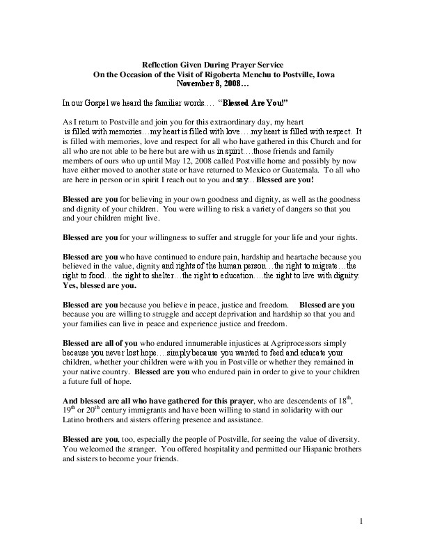 Reflection given during prayer service on the occasion of the visit of Rigoberta Menchu to Postville, Iowa, November 8, 2008